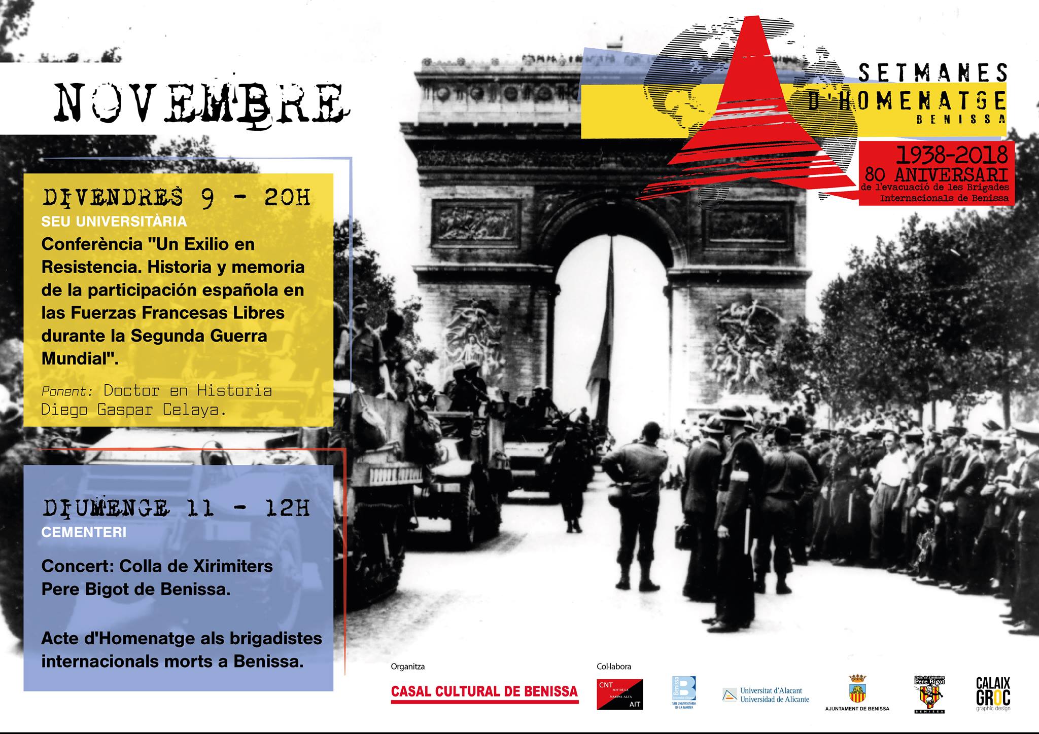 Benissa acollirà a partir de demà divendres les Setmanes d’Homenatge, que enguany commemoren el 80é aniversari de l’evacuació de les Brigades Internacionals de Benissa. Per a demà divendres (20.00h, Seu Universitària) hi ha prevista una conferència amb el títol “Un exilio en Resistencia. Historia y memoria de la participación española en las Fuerzas Francesas Libres durante la Segunda Guerra Mundial”, la qual estarà importada per Diego Gaspar Celaya, Doctor en Història.