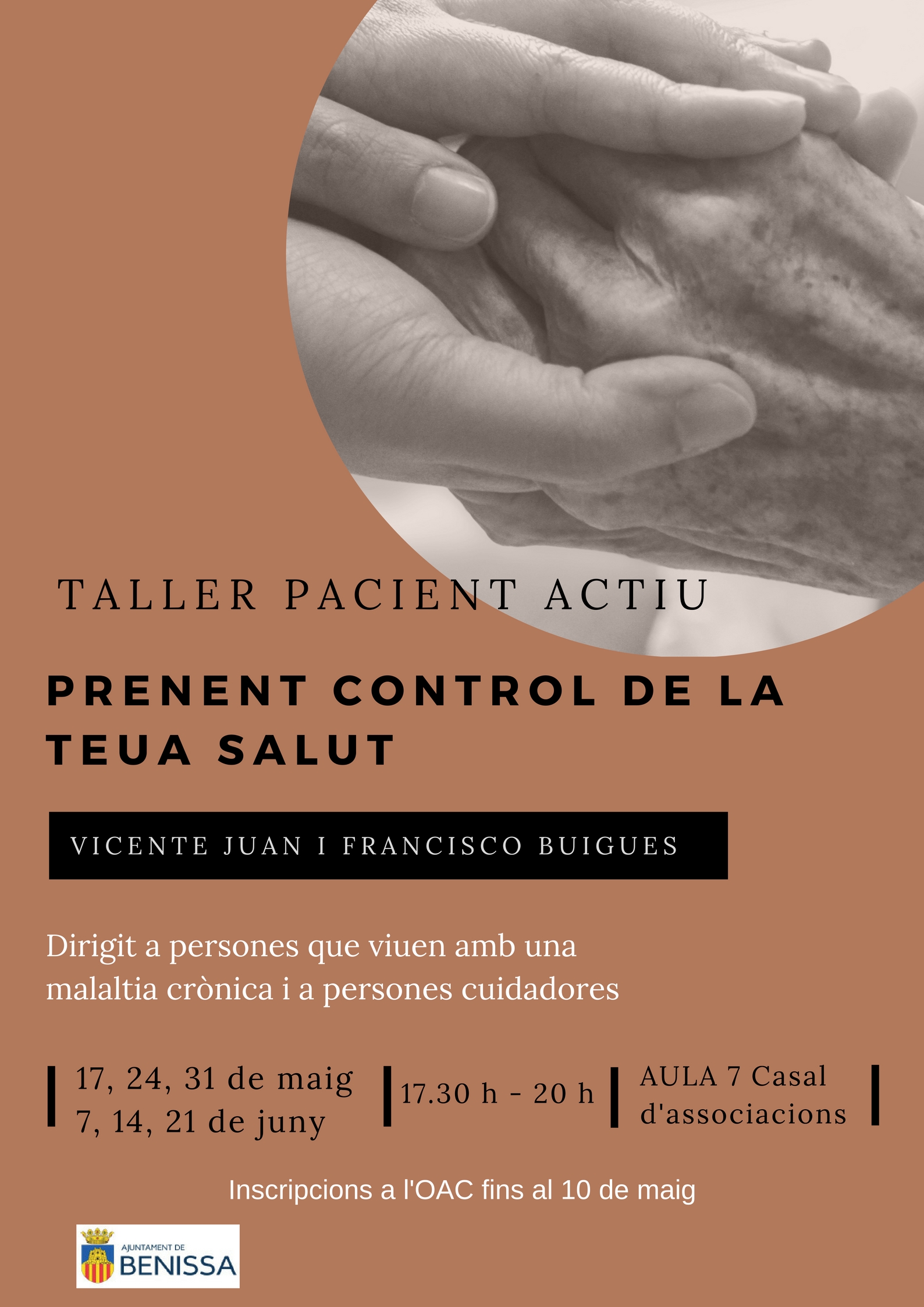 El programa “Pacient Actiu”, dissenyat per la Conselleria de Sanitat, pretén donar suport a aquelles persones que viuen amb una malaltia crònica, oferint la possibilitat de poder realitzar millors cures per part de les persones cuidadores. A Benissa s’impartirà mitjançant 6 sessions que s’impartiran els pròxims dies 14, 24, 31 de maig i 7, 17 i 21 de juny en horaris de 17.30 a 20.00. a l’aula 7 del Casal d’Associacions.