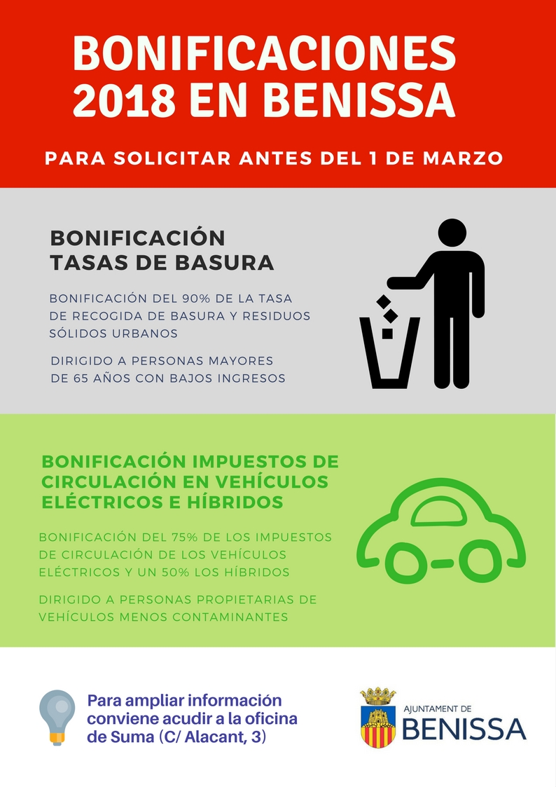 L’Ajuntament de Benissa amplia el termini, fins el dia 1 de març, per a sol·licitar la bonificació per taxes de brossa i impost de circulació en vehicles elèctrics i híbrids. L’ampliació de termini es destina a persones majors de 65 anys amb recursos escassos, en el cas de les taxes del fem, on podran bonificar un 90%.