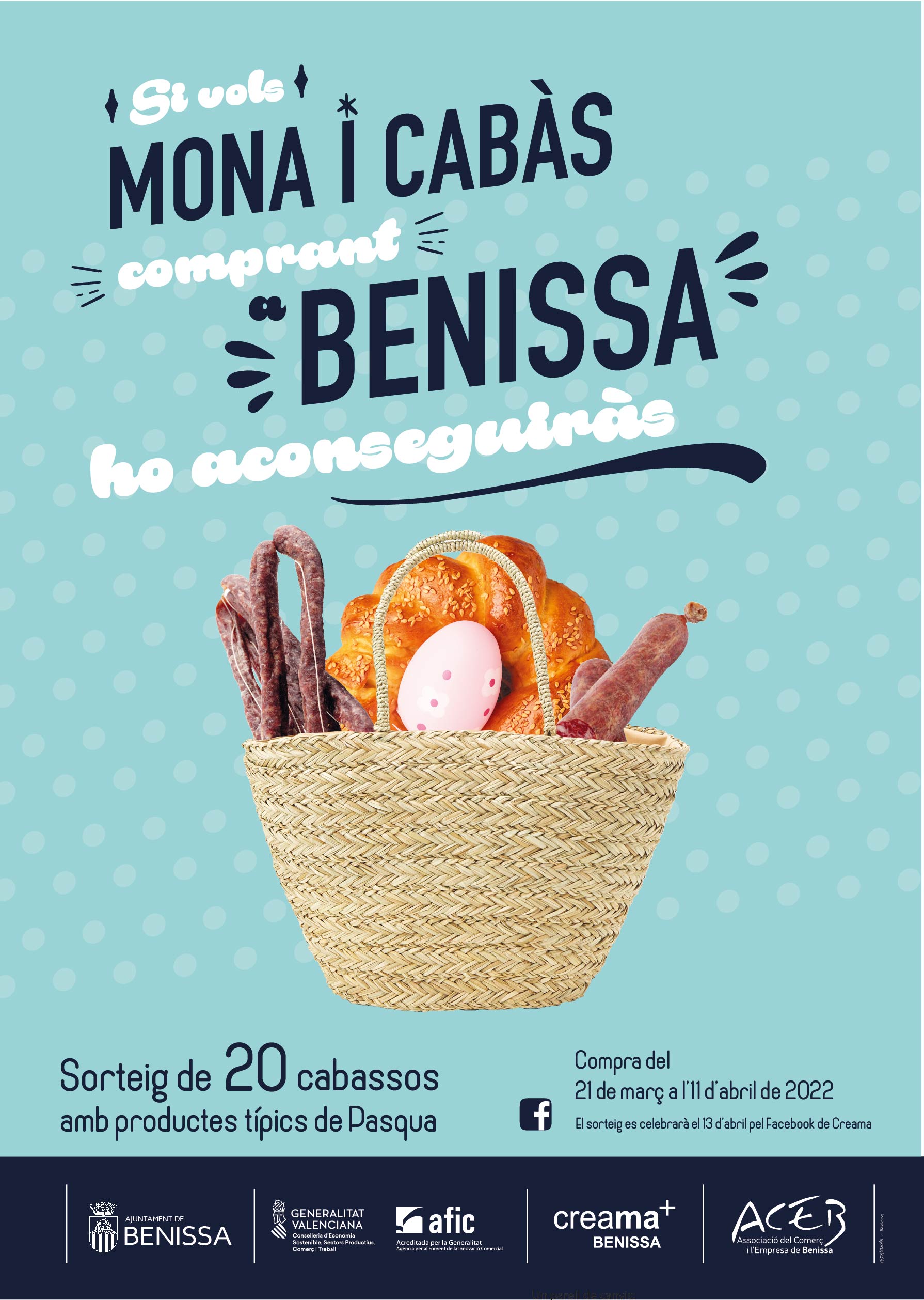 “Si vols mona i cabàs, comprant a Benissa ho aconseguiràs”, és el lema que s’ha tornat a triar per l’Ajuntament per a la campanya de compres de Pasqua. Després de l’èxit de l’anterior edició, es repeteix aquesta acció de promoció comercial organitzada per l’Associació del Comerç i l’Empresa de Benissa, amb la col·laboració de l’Ajuntament de Benissa a través d’AFIC-Creama. Com a reclam, ha dit la regidora Isabel Bou, “es participa en un sorteig fins al dilluns 11 d’abril d’una cistella amb productes típics de Pasqua”. El cabàs, la mona, l’embotit, el xocolate i la mistela. Tots aquests productes tradicionals de la nostra localitat, i molt benvolguts durant tot l’any, però especialment en els dies festius de Pasqua.