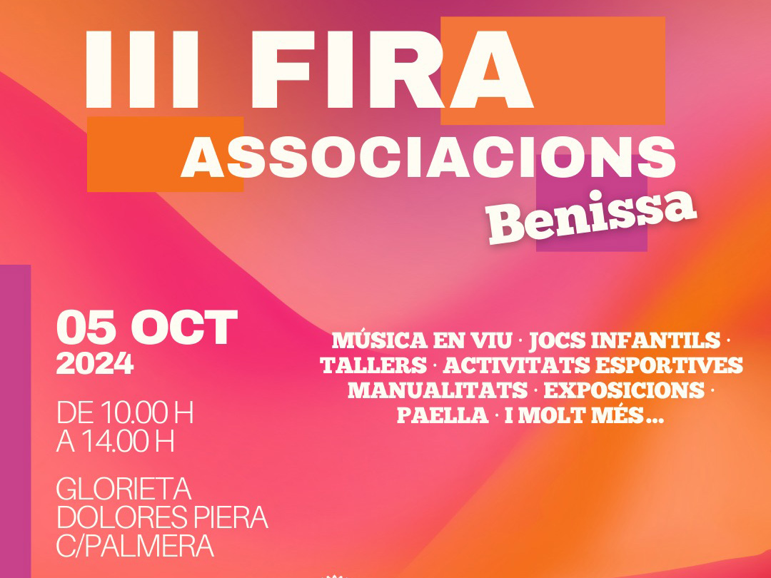 Aquesta edició se celebrarà el dissabte 5 d’octubre a la Glorieta Dolors Piera i al carrer Palmera. De 10h a 14h les associacions prepararan tallers, exposicions, jocs per a xiquets i xiquetes i també hi haurà música en viu a càrrec de Sifasol Benissa, Pentatònic School i la Societat Lírica i Musical de Benissa.