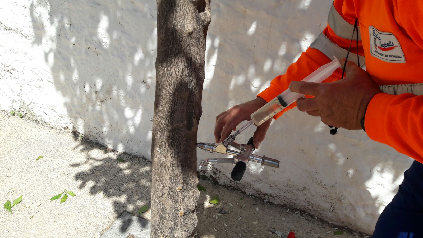 L’Ajuntament de Benissa, mitjançant Benissa Impuls, ha iniciat l’ús d’un nou i innovador sistema de fumigació més respectuós amb el medi ambient, ja que no s’escampa verí en l’aire, sinó que es realitza un procés d’endoteràpia que aplica el producte directament en el tronc de l’arbre a través d’una injecció, en una acció semblant a una vacuna.