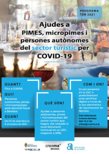 Segons les bases reguladores, podran ser beneficiàries les persones jurídiques o físiques legalment constituïdes que hagen reduït la mitjana mensual de facturació dels mesos compresos entre el 1r de juliol de 2020 i el 30 de juny de 2021 en almenys el 25% respecte de la mitjana mensual facturada en 2019. A més, han de pertànyer a sectors productius de l’àmbit turístic entre els quals es troba l’oci i l’hostaleria, l’allotjament reglat, les agències de viatges i oferta receptiva, les guies i les empreses de turisme actiu.