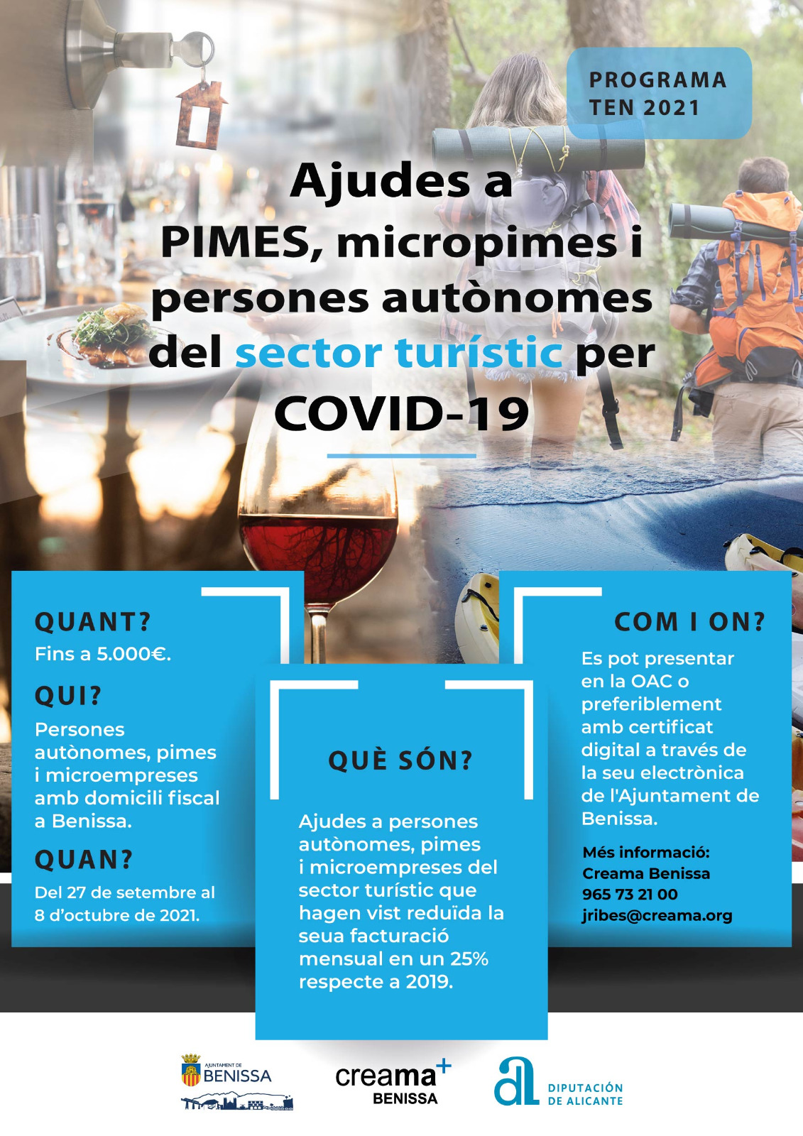 El Butlletí Oficial de la Província d’Alacant publicava divendres passat la convocatòria d’ajudes del programa ‘TEN 2021’. Ja és possible sol·licitar-les per mitjans telemàtics o de manera presencial a l’Oficina d’Atenció Ciutadana (OAC) en aquells casos en què la legislació de procediment administratiu ho permeta. El termini conclou el 8 d’octubre. Segons s’informa des de Comerç AFIC-CREAMA, àrea encarregada de la tramitació, l’imprés normalitzat estarà disponible en la web del portal del comerciant. L’objectiu d’aquestes subvencions és minimitzar l’impacte econòmic provocat per la Covid-19 a PIME, MICROPIME i autònoms del sector turístic, objectiu amb el qual porta treballant l’ajuntament benisser des de l’inici de la pandèmia.