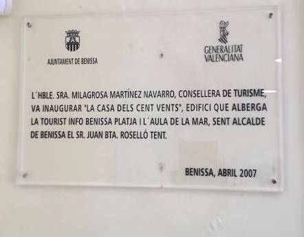 En aquest cas, la placa està situada a l’oficina de turisme que l’Ajuntament de Benissa té situada a la zona costanera, en la coneguda com a Casa dels 100 vents, situada a la carretera CV 746 entre el port esportiu de Les Bassetes i la Cala La Fustera, i que va ser inaugurada en 2007 per Martínez quan era consellera, i en presència del batle i regidors de la corporació d’eixa època.