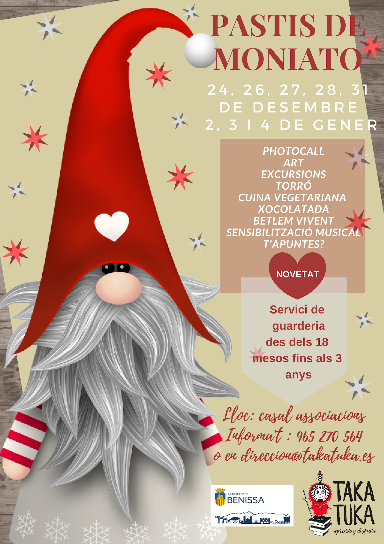 Carol Ivars, regidora de Joventut i de Comerç, destaca que “el Pastís de Moniato proposa activitats molt diferents a les que realitzen en el dia a dia del col·legi, i aposta per valors tradicionals, reforçant les nostres arrels”. Chelo Molines i Vanessa Molines, representant a Taka Tuka, l’empresa local que realitza els tallers, expliquen que la diversitat en els tallers i activitats suposa un dels atractius d’aquesta edició: “des del taller de sensibilització musical al costat de SIFASOL” (l’escola de música moderna de Benissa en la qual cantaran ‘nadales’), “un Betlem teatralitzat” o l’elaboració de “torró blanet”, a partir de la recepta de Luisa i Carmen Soliveres. També oferiran un taller de cuina saludable (‘Fartera, fuig!’) i una xocolatada “que elaboraran els propis participants”.