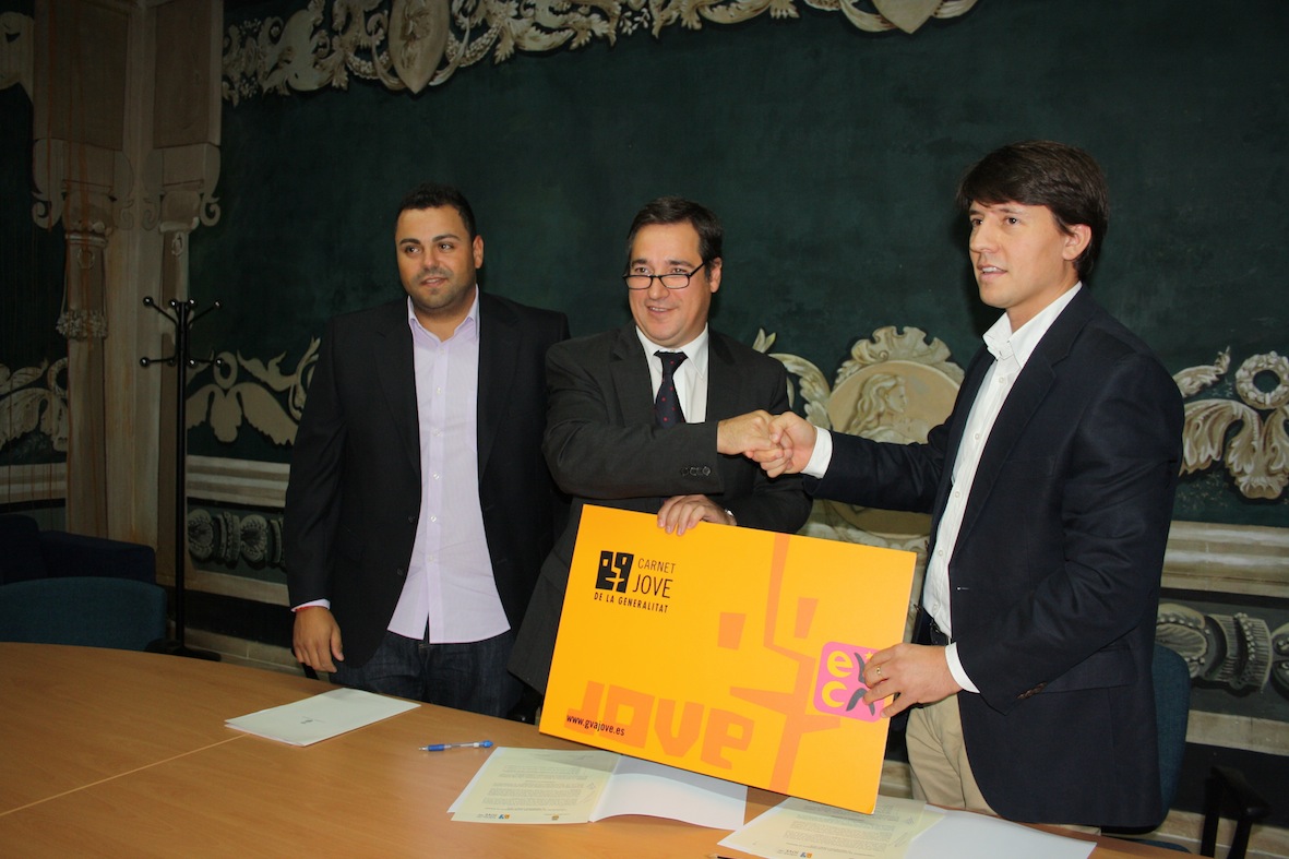 El director de Joventut i de l’IVAJ.GVA JOVE, Marcos Sanchis, i el batle de Benissa, Juan Bautista Roselló, han signat l’acord de vinculació a la xarxa de Carnet Jove de la Generalitat. A l’acte ha assistit el regidor de Joventut de la localitat, Jorge Ivars.