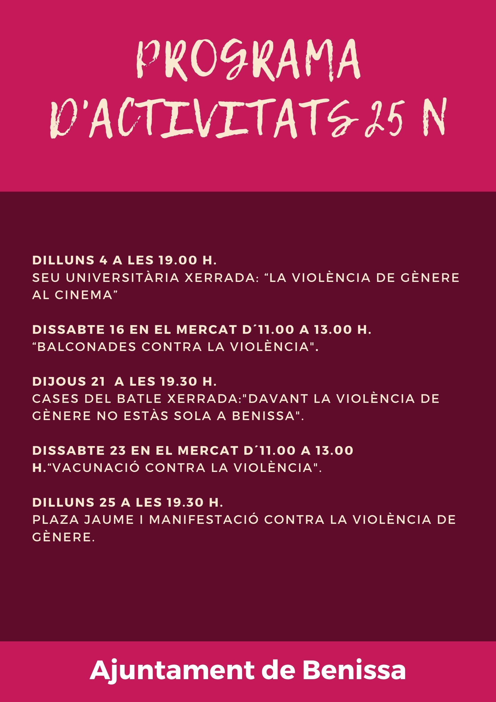 El dilluns dia 4 a les 19.00h en la Seu Universitària tindrà lloc una xerrada-col·loqui amb el títol “La violència de gènere al cinema”. El dissabte 16 en el mercat d’11.00 a 13.00 se celebrarà l’activitat “Balconades contra la violència”. El dijous 21 els serveis d’atenció municipals donaran una xerrada informativa a les 19.30 en l’espai cultural Cases del Batle titulada: “Davant la violència de gènere no estàs sola a Benissa”. Eixe cap de setmana, el dia 23, està prevista “La vacunació contra la violència” d’11.00 a 13.00 que també es desenvoluparà al mercat. En aquesta ocasió amb la col·laboració de l’Associació de Víctimes MATRIA.