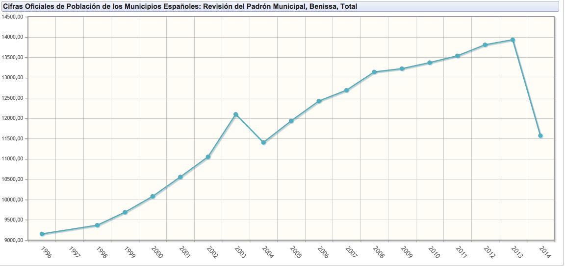 L’Institut Nacional d’Estadística (INE) acaba de publicar a la seua pàgina web les dades del padró de 2014 i el resultat per a Benissa és que hi ha 11572 persones, una baixada de 2360 habitants respecte les dades de l’any passat, en què Benissa comptava amb 13932 habitants.