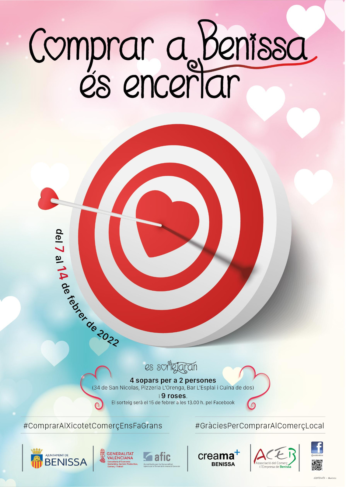Dilluns que ve, dia 7, comença la campanya local de comerç “Comprar a Benissa és encetar”. Una acció promocional amb la qual es pretén aprofitar la setmana de l’amor per a recordar a la ciutadania de Benissa la importància d’adquirir productes als establiments locals. Com a incentiu, l’Ajuntament sortejarà quatre sopars per a dos persones als restaurants 34 de Sant Nicolau, Pizzeria L’Orenga, Bar l’Esplai i Cuina de dos. Les persones afortunades també rebran com a obsequi un dels símbols que millor reflecteixen l’amor, la rosa roja. El sorteig tindrà lloc el dia 15 d’aquest mateix mes a les 13h a través del Facebook de la regidoria.