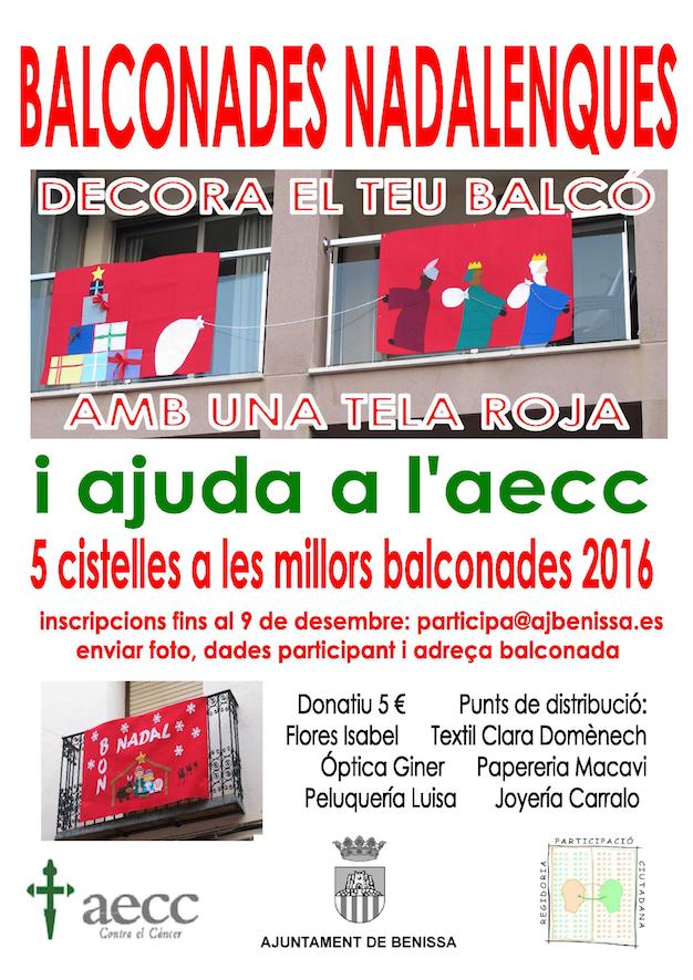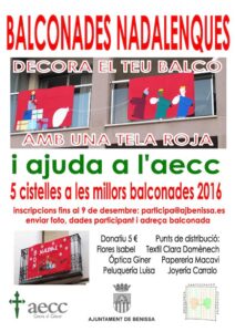 En col·laboració amb l’AECC de Benissa es distribuiran entre la població unes teles roges per a engalanar les balconades de la població a canvi d’un donatiu que es destinarà íntegrament a la lluita contra el càncer.