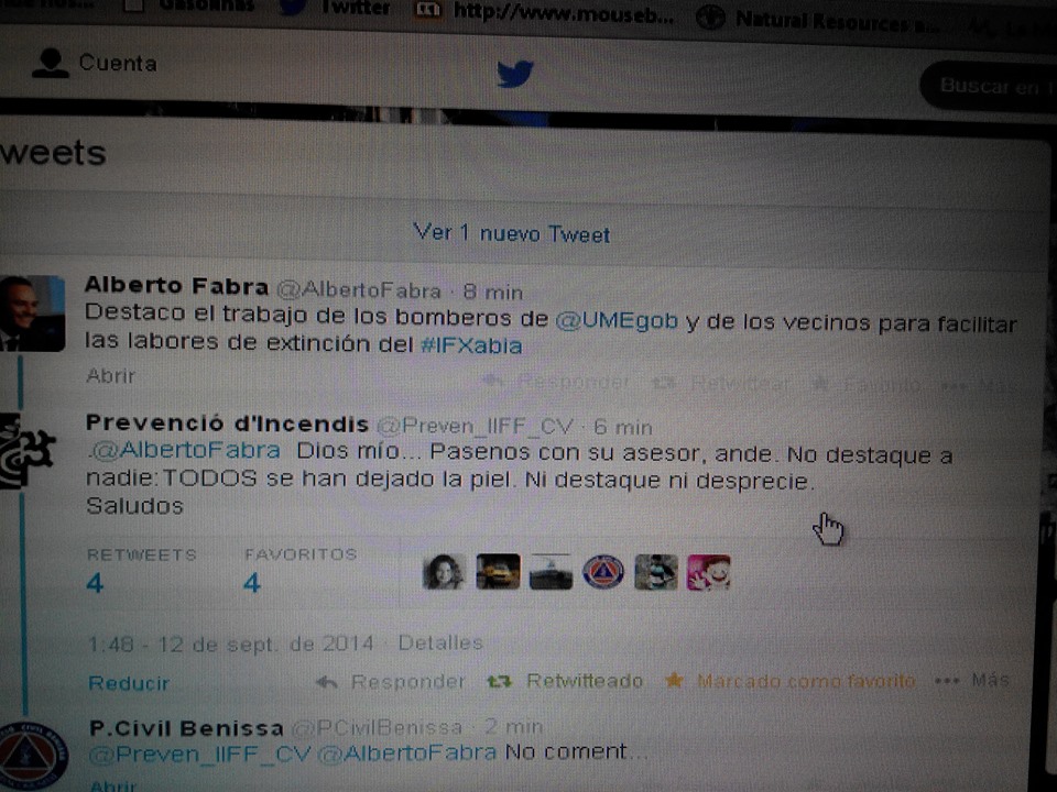 Poc després, el president de la Generalitat, Alberto Fabra, publicava una piulada (esborrada a hores d’ara) al seu compte de Twitter en què destacava la tasca de la UME i dels veïns de Xàbia en les tasques d’extinció.