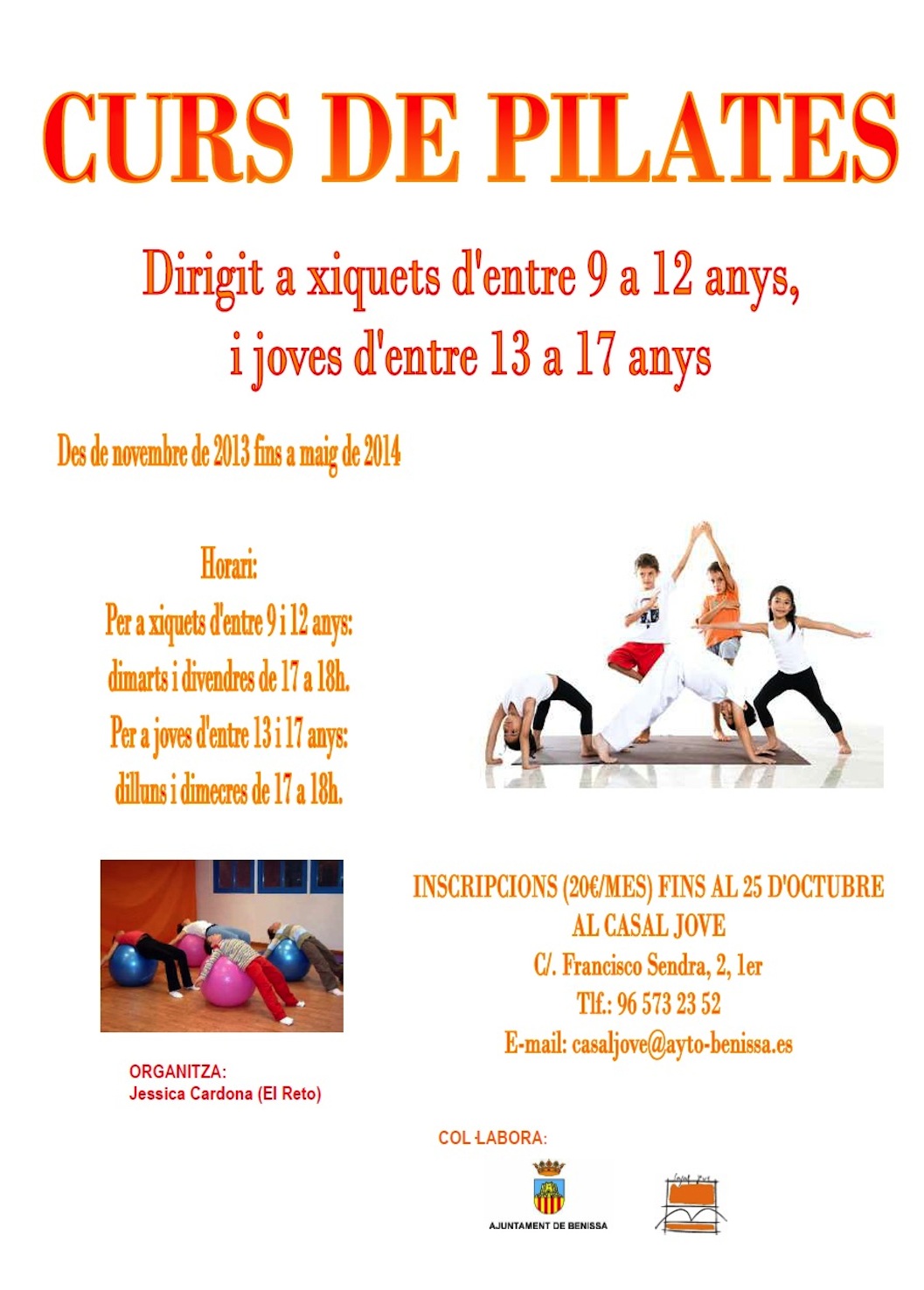 A partir del mes de novembre, els xiquets i joves que tinguen entre 9 i 17 anys podran practicar la disciplina del pilates mitjançant jocs. Aquesta activitat, organitzada per Jessica Cardona (El Reto), amb la col·laboració de la Regidoria de Joventut de l’Ajuntament de Benissa, es durà a terme a la sala polivalent del Casal Jove.