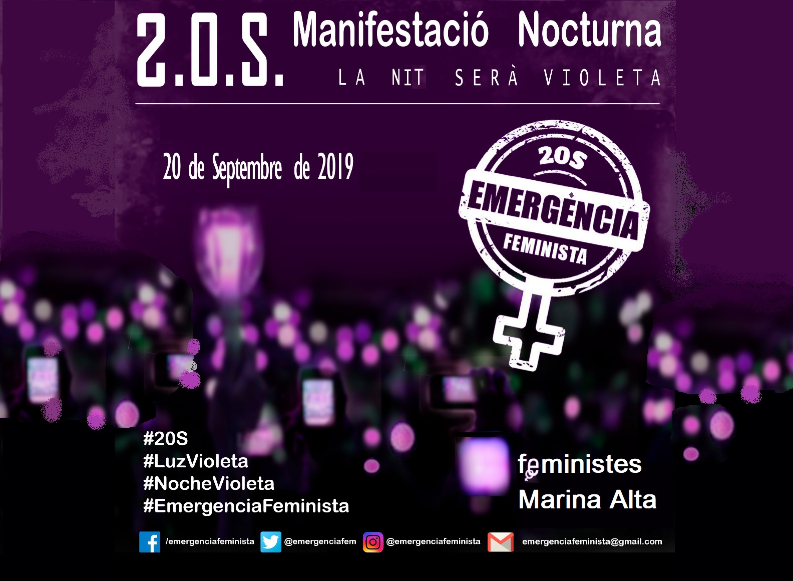 Les associacions i col.lectius feministes sota signants ens unim a la declaració d’Emergència Feminista, signem el comunicat i convoquem la ciutadania de la Marina Alta per al proper 20 de setembre a omplir els carrers dels nostres pobles en una Manifestació Nocturna amb el símbol de la llum violeta. Informarem pròximament sobre els pobles i llocs on es realitzaran les concentracions i manifestacions.