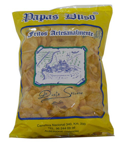S’està esgolant per una fina corda la percepció d’aquest aliment com a nou integrant del gourmet baralladís sense deixar de ser més de poble que Albelda. Al voltant d’açò, el dissenyador Xavi Calvo observa: “en general no són bons exemples de packaging. Ni ho van ser en el seu moment (perquè dubte que alguna d’aquestes bosses siga d’aquest segle) ni ho són ara. Està la del plagi d’Heidi que, dic jo, intenta captar els xiquets; la que es tira a la piscina buida del joc conceptual i converteix unes inicials en un intent de creïlles tallades perquè caiguen en l’oli fumejant; la il·lustració del calder, burla digna de WordArt… Potser Duso són els que almenys s’han anat exclusivament a tòpics clàssics (tipografia, il·lustració) i encara que no del tot ben conjugats han sabut situar-se en aquest context amb millor fortuna. Tampoc seria fàcil trobar aquest buit del disseny de paquet de papes entre aquestes i les dels aperitius “mainstream” sense caure en modes vintage”.