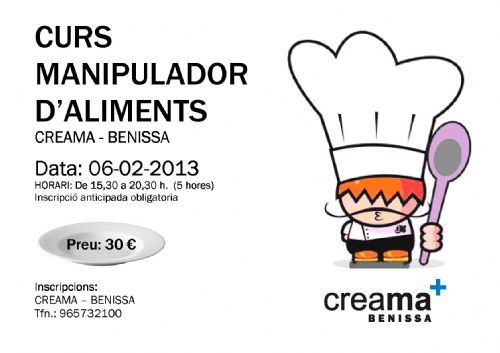 Creama Benissa organitza un curs de manipulador d’aliments per al pròxim 6 de febrer. El curs es realitzarà a l’aula de formació de Creama Benissa, en horari de 15.30 a 20.30.