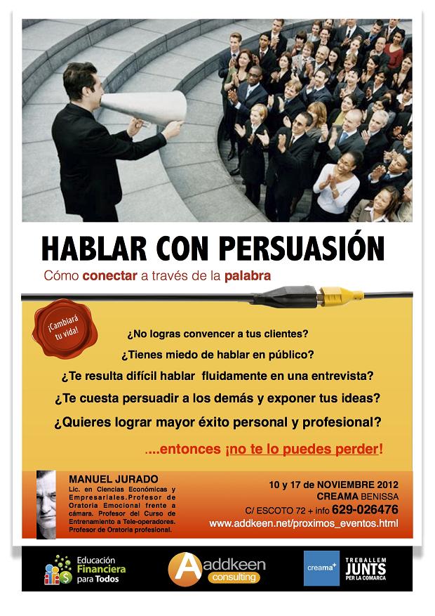 Els dies 10 i 17 de novembre, a partir de les 9.30h i fins les 14.00h, es durà a terme en les instal·lacions de Creama Benissa el curs intensiu d’oratòria emocional “Hablar con Persuasión: Cómo conectar con los demás a través de la palabra” a càrrec del reconegut orador Manuel Jurado Mesa.