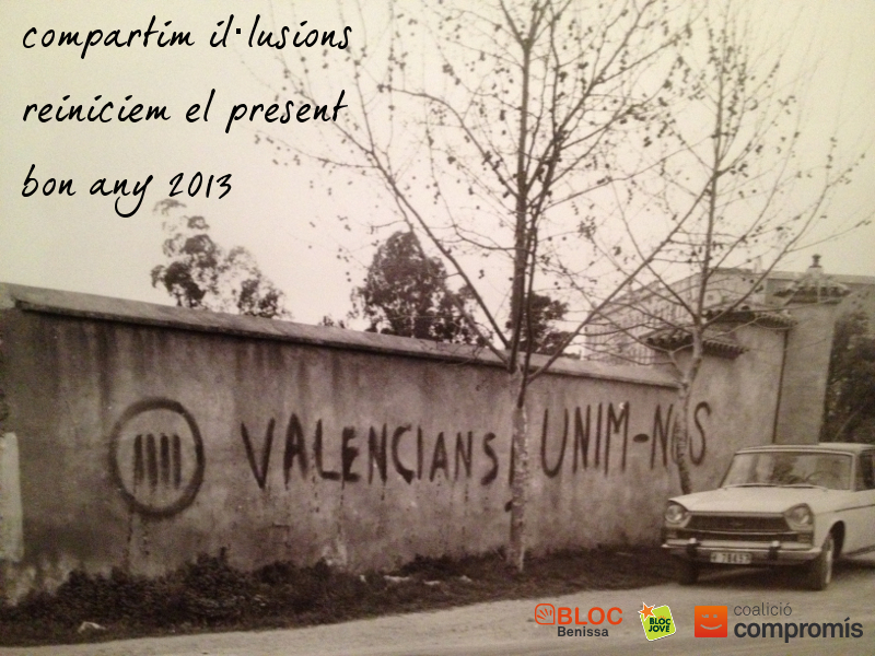 I per al 2013 que està a punt de començar desitgen que “aquells que ens governen, a Benissa, a València i a Madrid primem en les seues decisions el benestar dels seus ciutadans i no, per exemple, rescatar bancs i caixes amb els nostres diners abans que a les persones. Governar, mai no pot ser repartir dolor, els que ens governen han de prendre sempre les seues decisions pensant en intentar garantir la felicitat i el benestar dels seus ciutadans, justament el contrari del que estan fent. El meu desig és que la gent perda totalment la por d’eixir al carrer i exigir tot allò que és nostre i que ens hem guanyat”.