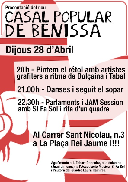 A partir de les 20h hi haurà un acte de portes obertes perquè la gent puga visitar les instal·lacions. A més, sonarà la dolçaina i el tabal, i uns artistes graffiters pintaran el rètol del Casal Popular.