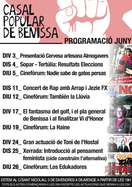 El Casal Popular de Benissa ha preparat per al mes de juny un programa variat d’activitats per a tot tipus de gent. Tots els actes tindran lloc a la seua seu (C/ Sant Nicolau, 3) a les 20.00h, excepte les actuacions que seran a les 23.00h.