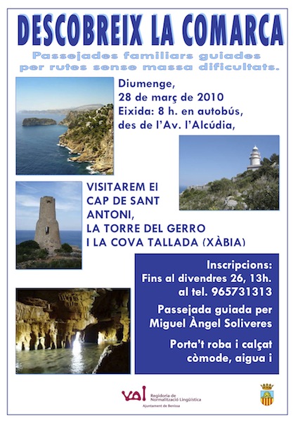 La Regidoria de Normalització Lingüística ha organitzat una nova excursió del cicle “Descobreix la nostra comarca” per a aquest diumenge 28 de març en què els assistents podran conèixer el Cap de Sant Antoni, la Torre del Gerro i La Cova Tallada de Xàbia. Es tracta d’una excursió que serà guiada per Miguel Angel Soliveres, benisser i coneixedor de la zona.