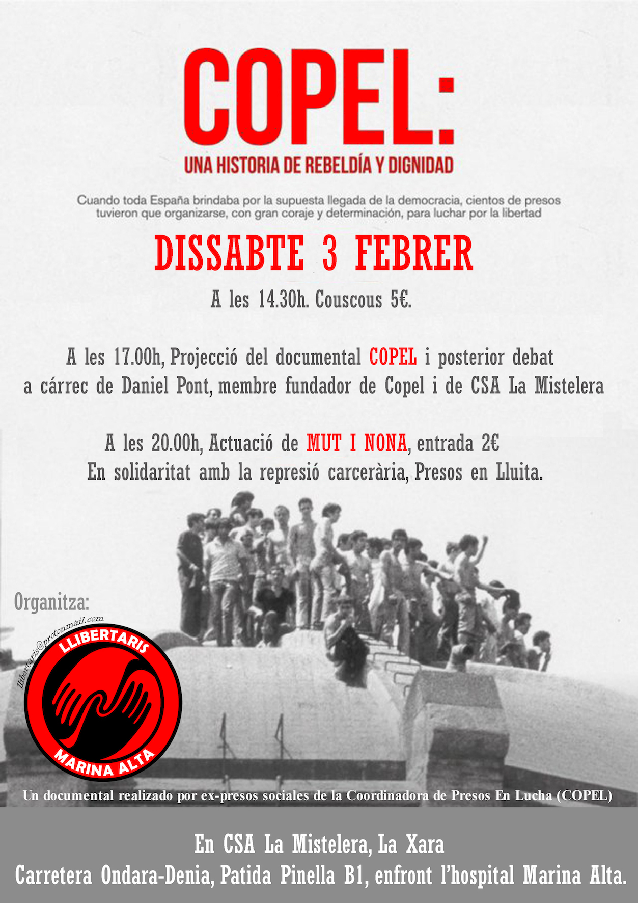 Llibertaris Marina Alta ha organitzat, el pròxim 3 de febrer, l’emissió del documental “Copel: una historia de rebeldia y dignidad”, que tindrà lloc a les 17.00h al CSA La Mistelera de La Xara. Prèviament hi haurà un dinar amb couscous a les 14.30h per 5€ i en acabar, actuació de Mut i Nona per 2€ en solidaritat amb la represió carcerària, Presos en Lluita.
