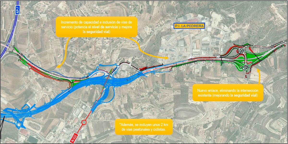 Segons expliquen des del Ministeri aquesta actuació va sorgir en la fase final d’execució de les obres de la Variant de Benissa, motivat per la liberalització de l’autopista de peatge AP-7, quan es va detectar la necessitat de realitzar una actuació complementària a l’entorn del nou enllaç nord de Benissa i en el tram que fita amb la N-332 a l’altura del polígon industrial La Pedrera. La seua intencionalitat és assegurar el correcte funcionament de l’enllaç i millorar la seguretat viària.