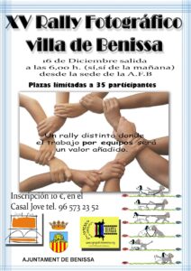 Les Regidories de Joventut i Turisme de l’Ajuntament de Benissa en col·laboració de l’Agrupació Fotogràfica de Benissa organitza el XVé Ral·li Fotogràfic de Benissa. Segons ha comentat el regidor de Joventut, Jorge Ivars, “aquest ral·li és totalment diferent als anteriors, aquesta vegada és molt important el treball en equip”.