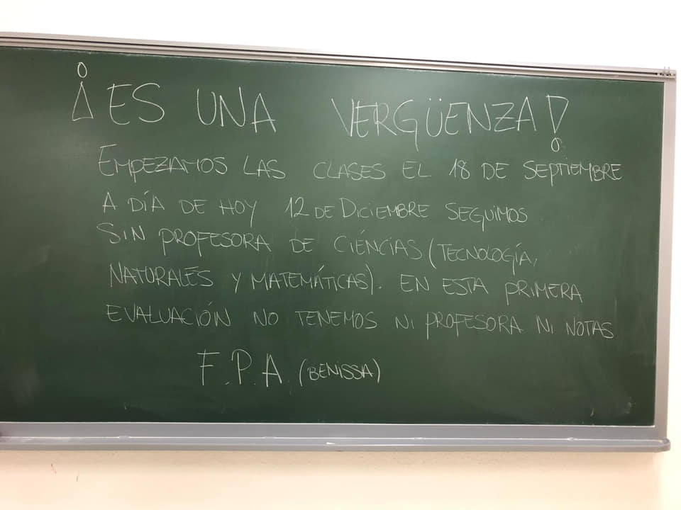 Els alumnes de l’Escola d’Adults de Benissa continuen sense professora de ciències a les portes de les vacances de Nadal. Tot i que van començar el curs el 18 de setembre, els alumnes no han pogut rebre les classes de tecnologia, ciències naturals i matemàtiques i no han estat avaluats d’aquestes matèries, amb l’entrebanc que això suposa per a la seua formació. Alguns alumnes han penjat en les xarxes socials una imatge denunciant la situació.