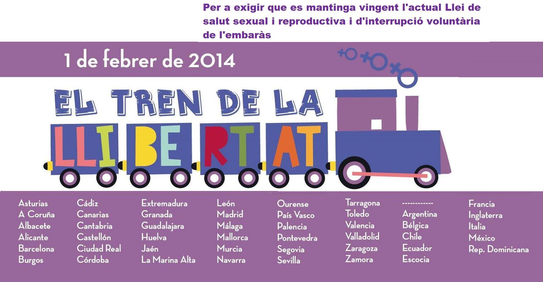L’arribada a Madrid està prevista al voltant de les 11h per incorporar-se al Tren de la Llibertat, organitzat en defensa dels drets de la dona a decidir sobre el seu cos, la seua sexualitat i maternitat; en contra de la reforma de la Llei Gallardon; i per exigir el manteniment en vigor de l’actual “Llei de salut sexual i reproductiva i d’interrupció voluntària de l’embaràs”. A les 12h serà la concentració de les delegacions a l’estació d’Atocha. A les 12.30h s’iniciarà la marxa cap al Congrés dels Diputats, on es lliurarà el document “Perquè jo decidisc”, dirigit al President Del Govern, President del Congrés, ministra Ana Mato, ministre Gallardón i distints grups parlamentaris.