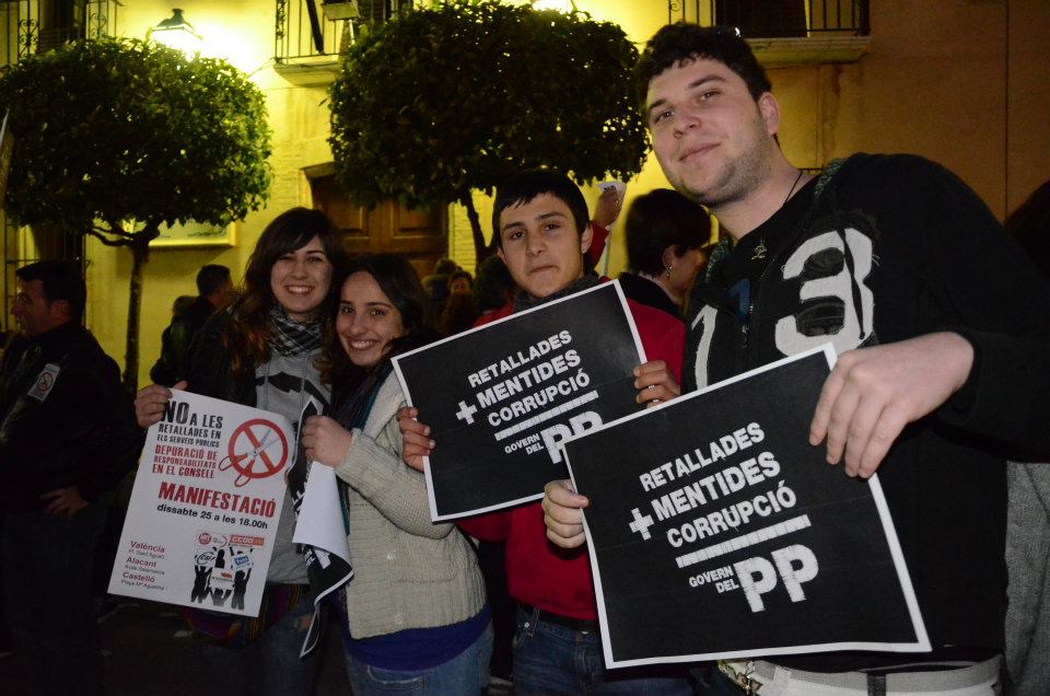 A Dénia, prop de 300 persones es van concentrar a la plaça de la Constitució, on les alumnes d’Arts Escèniques de l’IES Chabás, Selma, Aida, Alba, Pamela i Mireia, van representar mitjançant globus la política de grans esdeveniments del Consell, segons van assenyalar era la metàfora “d’on estan aquests diners”.