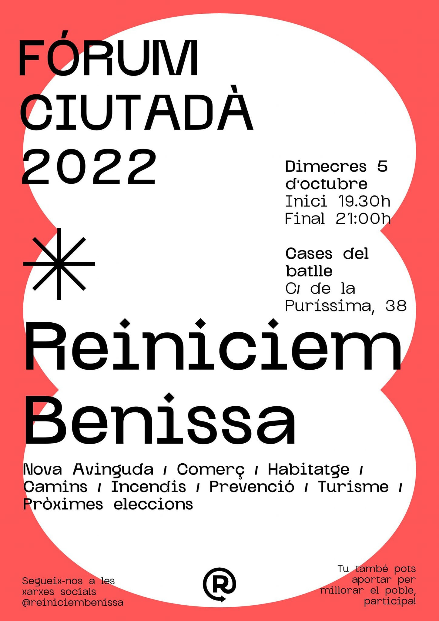 Després de molt de temps sense poder organitzar reunions físiques a causa de les restriccions causades per la pandèmia, Reiniciem Benissa convoca el Fòrum Ciutadà número divuit, un espai de retrobament, debat i reflexió, per tal d’abordar temes d’actualitat entre la societat benissera.