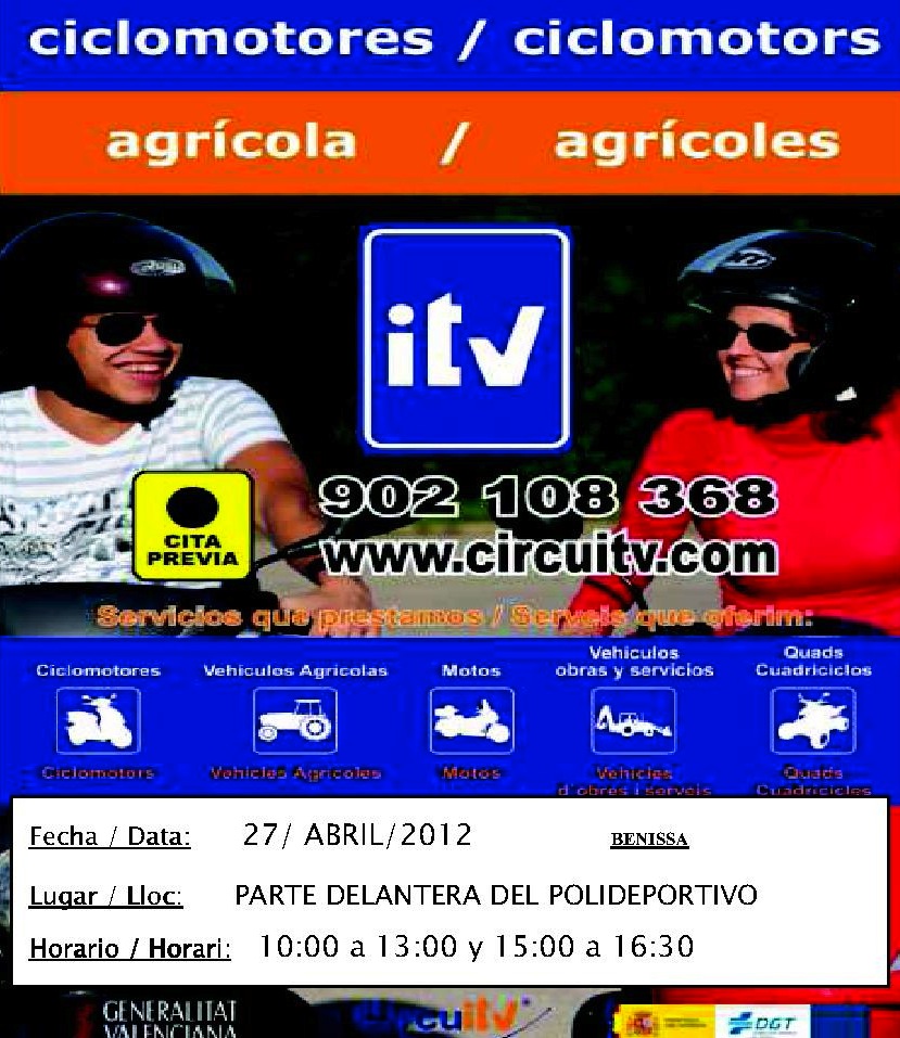S’informa que el dia 27 d’abril la ITV de ciclomotors, vehicles agrícoles, motos, vehicles obres i serveis, quads i quadricicles estarà disponible a la part davantera del Palau Sant Pere de Benissa. L’horari serà de 10.00 a 13.00 i de 15.00 a 16.30.