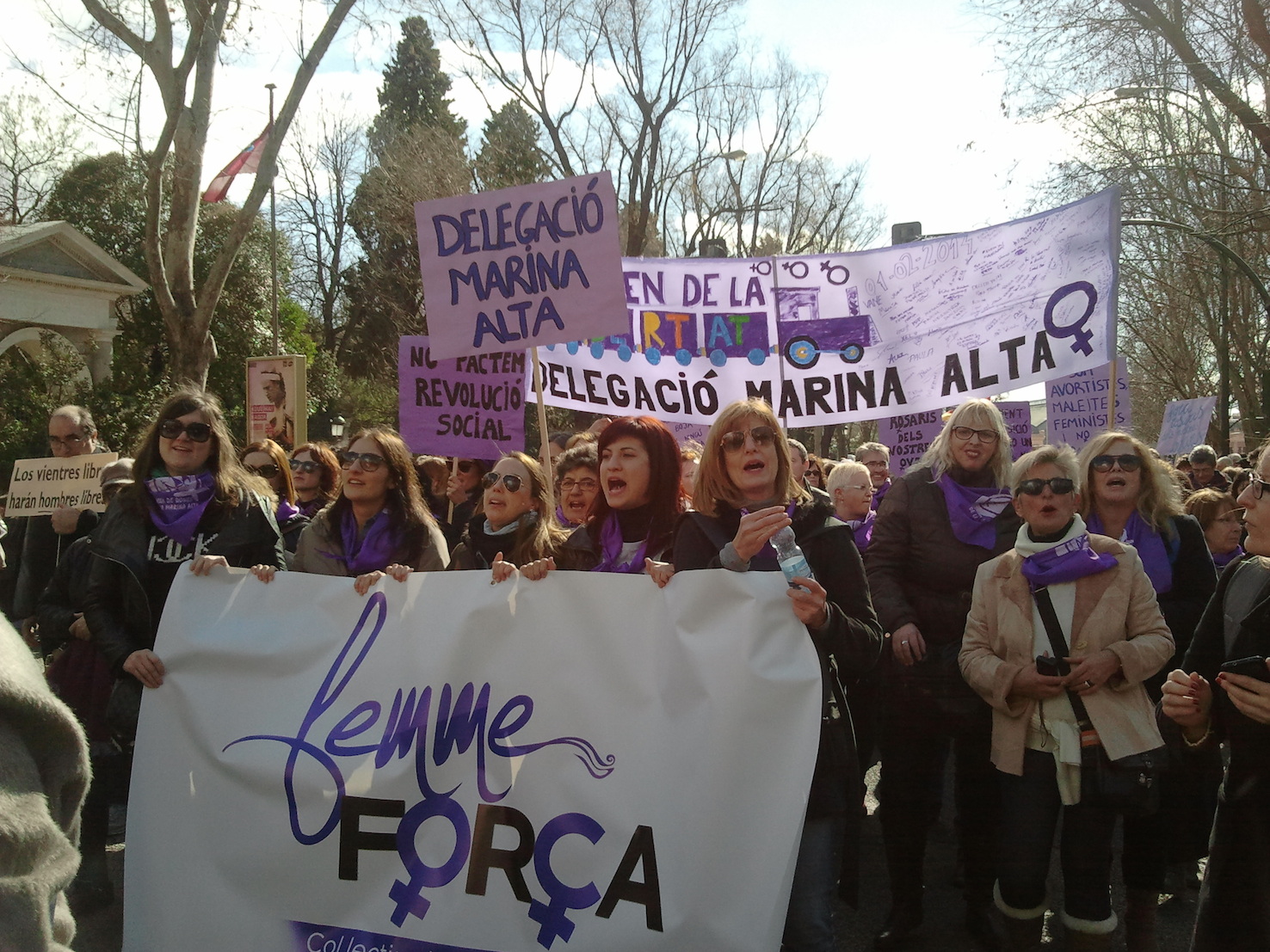 La delegació de la Marina Alta sumava quasi un centenar de dones i alguns homes, de Benissa, Calp, Teulada, Xàbia, Gata, Pedreguer, la Xara, Jesús Pobre, Dénia, Orba, Pego, Beniarbeig, El Verger, i també d’Altea, Benidorm, Xàtiva i Gandia. Hi havia representació de les associacions Dones Cabal de Pego, Dones d’Orba i Femme força de Pedreguer.