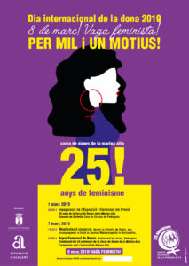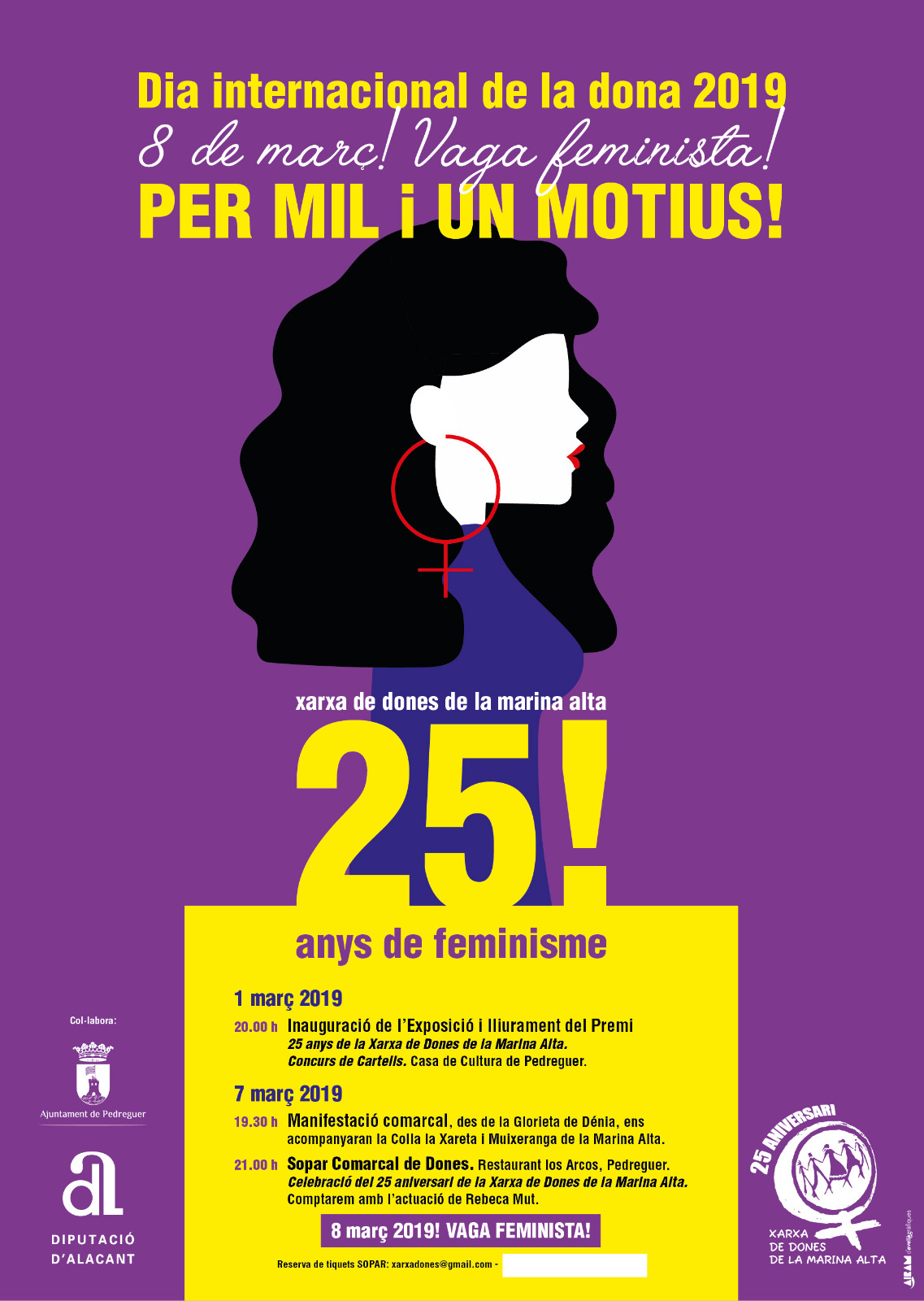 La Xarxa de Dones de la Marina Alta compleix enguany 25 anys i ha organitzat un programa especial amb motiu del 8 de Març, Dia Internacional de la Dona. Així, l’1 de març (20h, Casa de Cultura de Pedreguer) està prevista la inauguració de l’exposició i lliurament del premi del “Concurs de Cartells 25 Anys de la Xarxa de Dones de la Marina Alta”.