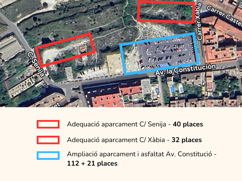 Les obres suposaran l’eliminació de les places d’aparcament en un dels carrils de l’avinguda i, per això, l’Ajuntament ha estat treballant en les últimes setmanes per a adequar noves zones d’aparcament en la zona. En total s’han habilitat noves places al carrer Senija (40 places) i carrer Xàbia (32 places) i, a més, s’ha ampliat l’aparcament de l’avinguda Constitució amb 21 noves places, a les 112 ja existents.