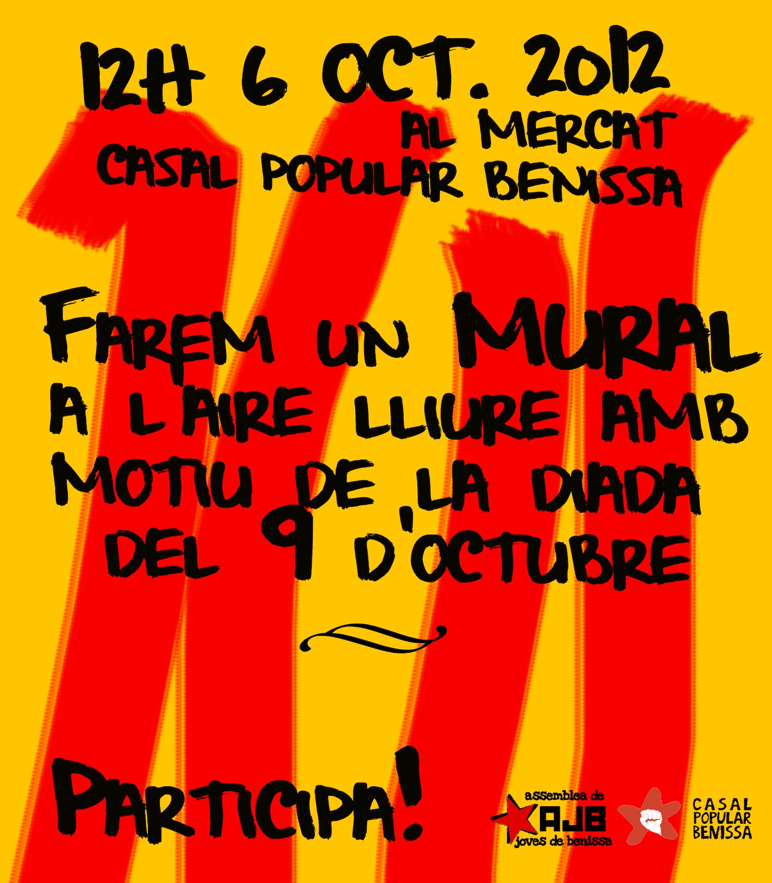 Amb motiu del 9 d’octubre, diada nacional del País Valencià, on es commemora l’entrada de les tropes del rei Jaume I a la ciutat de València l’any 1238, des de l’Assemblea de Joves de Benissa es pintarà un mural amb tots els xiquets i joves que passen pel Casal Popular dissabte 20 d’octubre al matí, homenatjant el dia dels Valencians, especialment en aquests temps tan difícils, on es pateixen atacs constants a la llengua (decret de les trilingüisme de la Generalitat); a la cultura, amb el 21% d’IVA; i el país, per la recentralització de l’estat i l’incompliment de l’estatut d’autonomia.