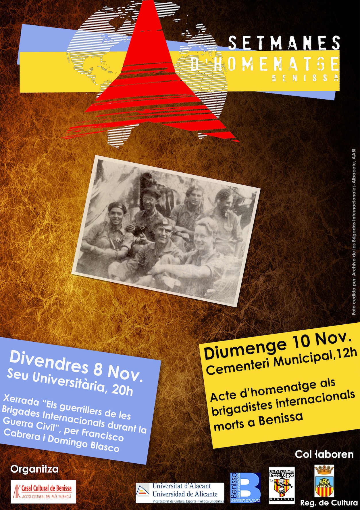 El programa d’actes previst és el següent inclou una xerrada el divendres 8 de novembre a partir de les 20.00h a la Seu Universitària La Marina amb el títol: ” Els guerrillers de les Brigades Internacionals durant la Guerra Civil”; que estarà a càrrec de Francisco Cabrera i de Domingo Blasco. L’acte compta amb la col·laboració de la Seu Universitària La Marina de Benissa.