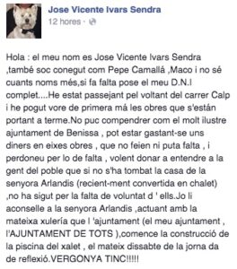 Yo soc Maria Francisca Arlandis, la propietaria de la casa en cuestió. i vullc que tota Benissa siga coneixedora de que si el poble de Benissa, a dia de huí, no té el carrer Calp ampliat, ensanchat, pot agrair-liu, al Sr. Juan Bautista Roselló, el alcalde de tots els Benissers, el que juga amb els dinerets dels Benissers i Benisseres a la seua conveniensia, sense contar amb el reste de la gent ni pensar en el que es millor per este poble.