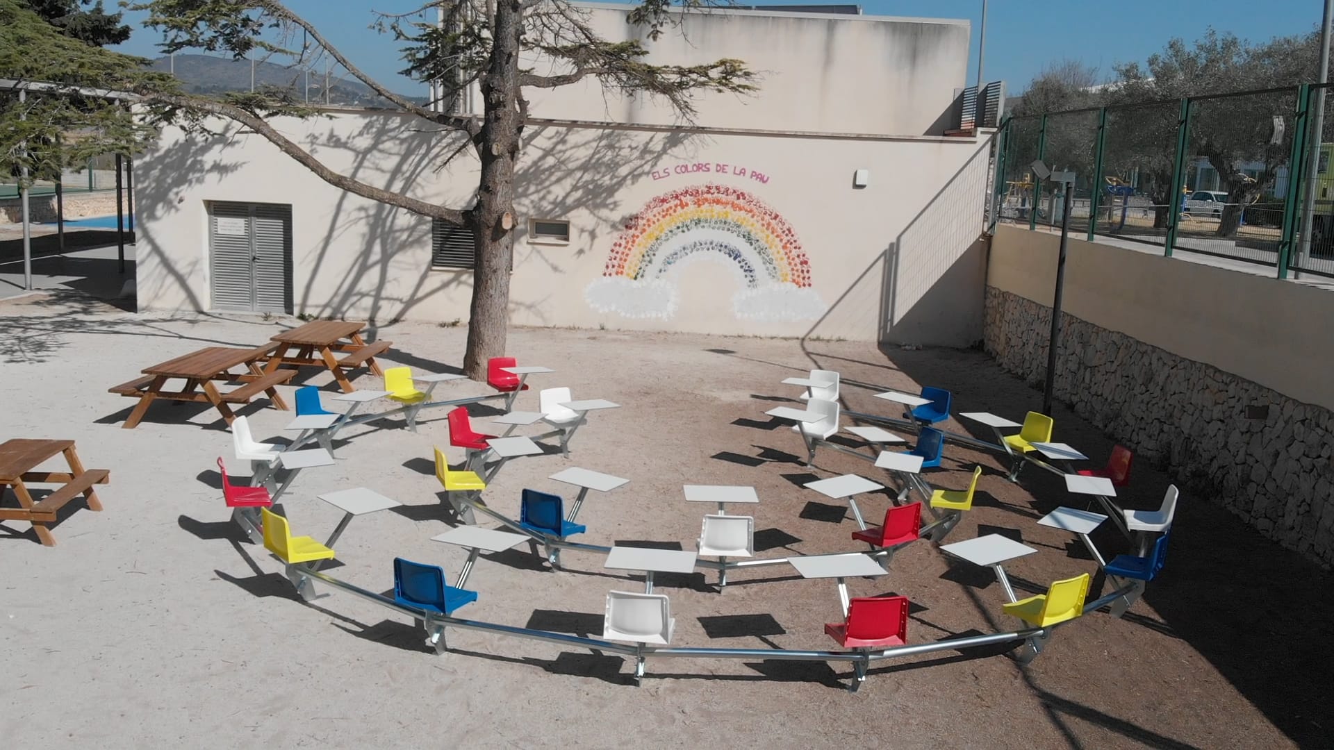 Unes aules en doble fila d’estructura metàl·lica en ferro galvanitzat, seients pvc i model amfiteatre per a afavorir la comunicació entre alumnes i professors.