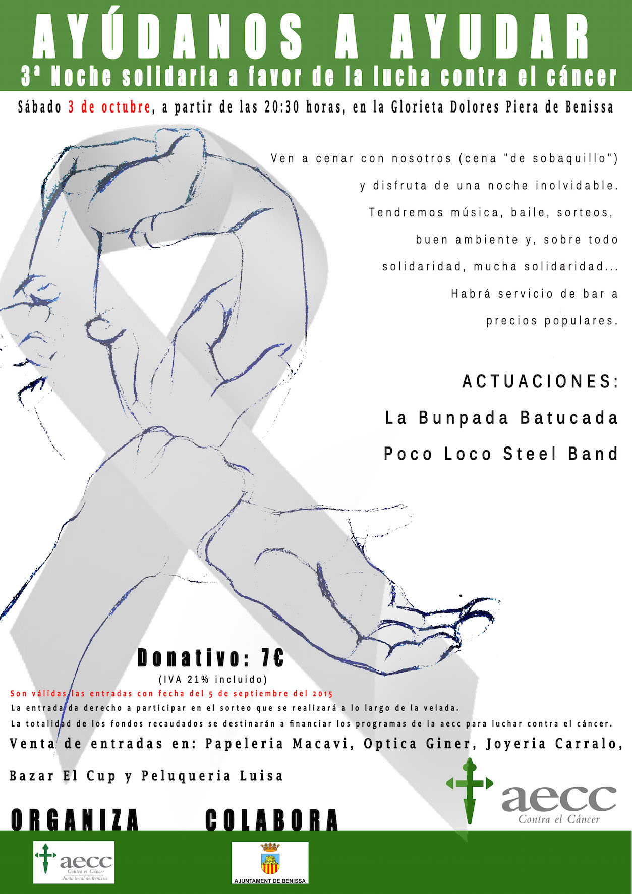 L’Associació Espanyola contra el Càncer de Benissa (AECC) celebra aquest dissabte 3 d’octubre la “Nit Solidària”, un esdeveniment que es va haver de suspendre el passat 5 de setembre a causa de la pluja, i que es va decidir traslladar a aquest cap de setmana que ve.