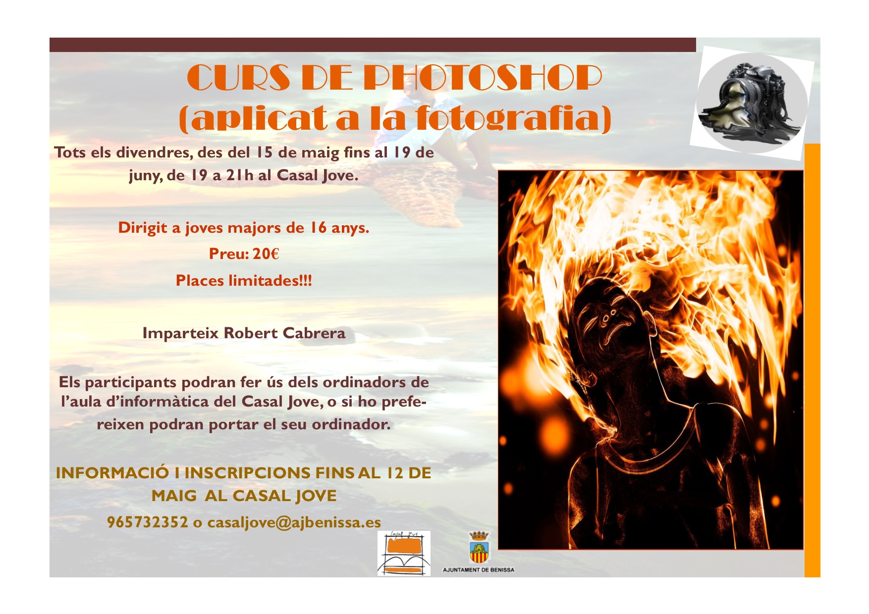 L’altra activitat que es durà a terme, tots els divendres, del 15 de maig al 19 de juny, de 19.00 a 21.00, serà el curs de Photoshop aplicat a la fotografia, organitzat amb la col·laboració de Robert Cabrera (Benilab).