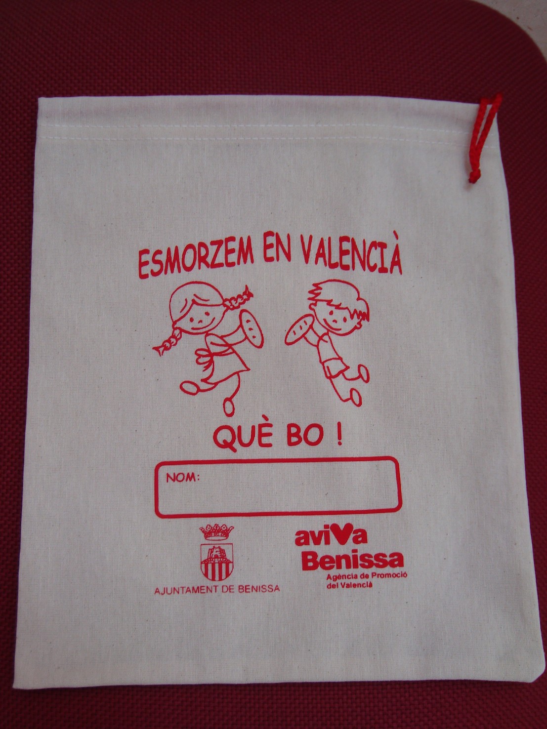 La campanya dóna continuïtat a la del curs 2013-2014, en què es van repartir saquets per a esmorzar a tots els alumnes d’infantil. Les bossetes, d’una mesura de 29×25 cm són de cotó 100% i han sigut estampades amb tints ecològics a l’aigua, pensant que contindrà aliments, amb els lemes: “Esmorzem en Valencià” i “Què bo!”. També s’ha col·locat un requadre perquè els xiquets posen el seu nom.