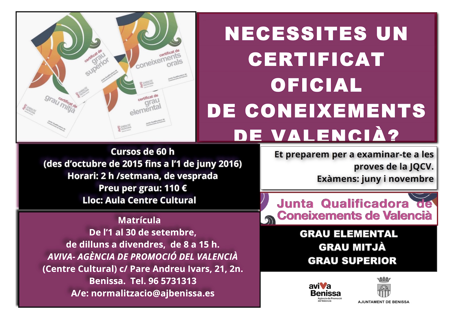 AVIVA BENISSA-Agència de Promoció del València obri el termini d’inscripcions per als cursos preparatoris per a superar les proves que convoca la Junta Qualificadora de Coneixements de Valencià (JQCV), graus Elemental, Mitjà i Superior. Són cursos de 60 hores que es realitzen a Benissa des d’octubre de 2015 i fins a finals de maig de 2016.