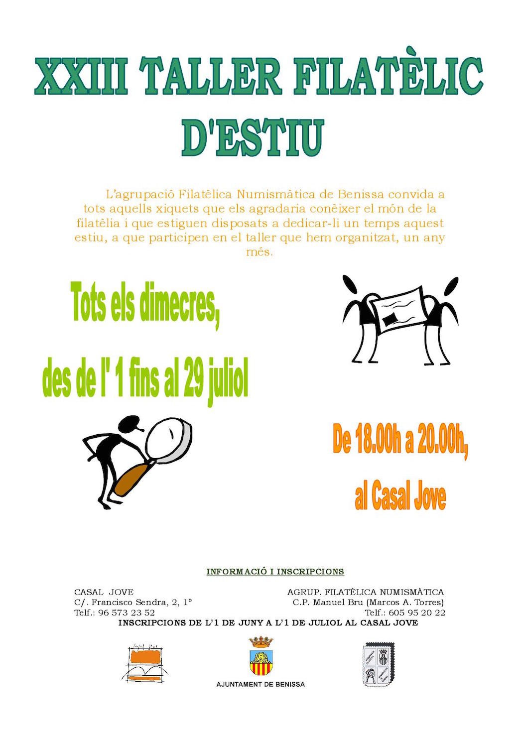 L’Agrupació Filatèlica i Numismàtica de Benissa, amb la col·laboració de la Regidoria de Joventut de l’Ajuntament de Benissa, com cada estiu, organitza el XXIIIé Taller filatèlic d’estiu.