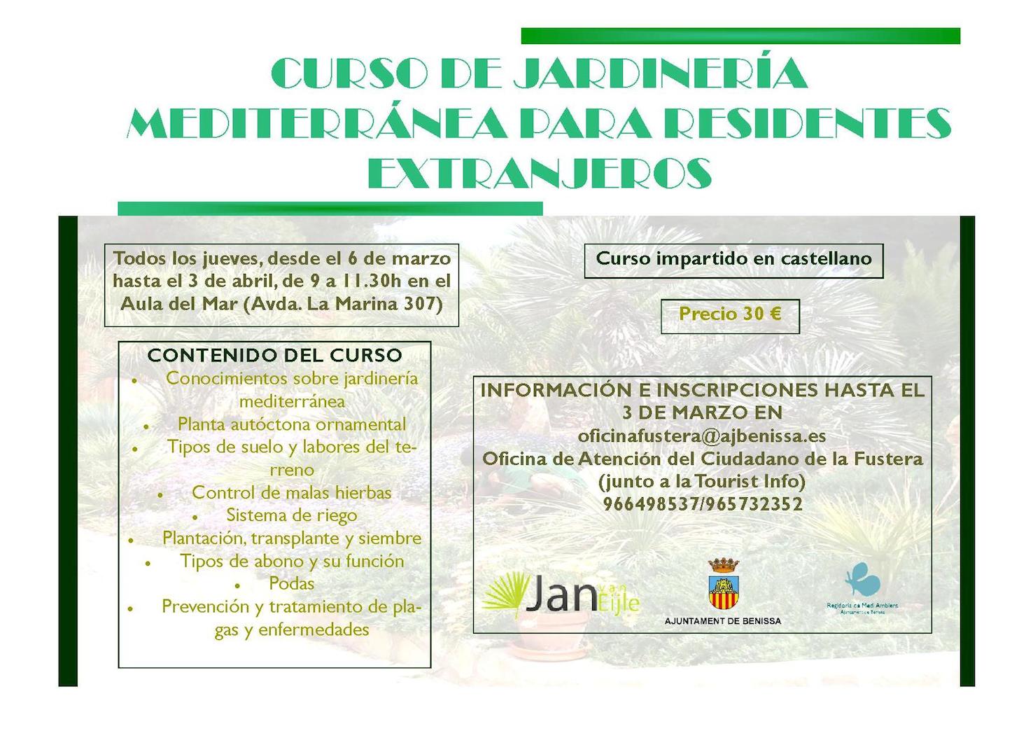 L’elecció de plantes és fonamental, i també saber on i com plantar-les, per això, amb la proximitat de la primavera (moment d’anar acabant amb les podes d’hivern, replantar, adobar, i fer tractaments preventius de malalties i plagues com els pugons, fongs o el tan temut morrut roig de les palmeres), des de la Regidoria de Residents Estrangers de l’Ajuntament de Benissa s’ha organitzat, en col·laboració amb Jan van Eijle, paisatgista amb més de 15 anys d’experiència dissenyant jardins, plantant i donant valor a la bellesa de les plantes autòctones, un curs de jardineria dirigit a residents estrangers perquè aprenguen que amb molt poc d’esforç poden aconseguir jardins espectaculars al llarg de tot l’any.