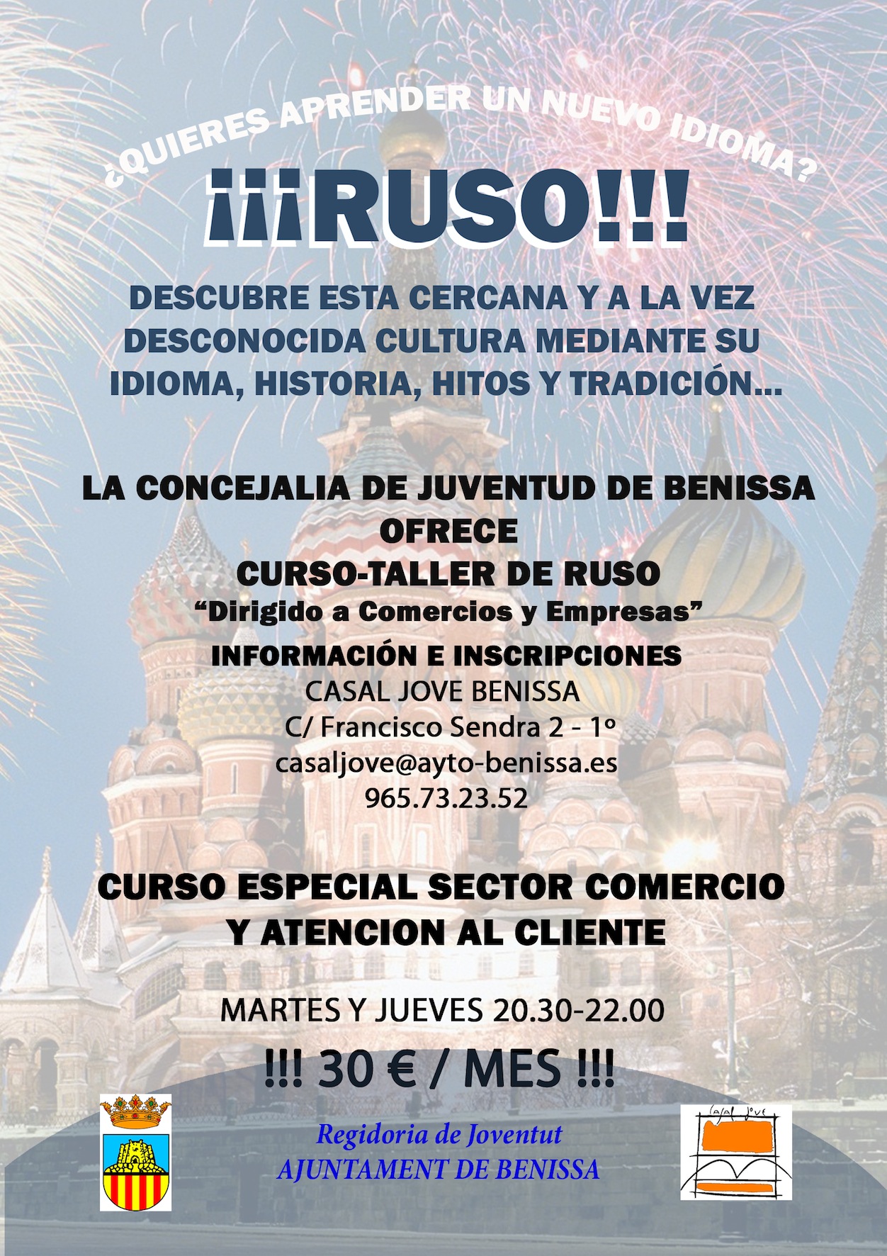 Actualment, moltes persones de nacionalitat russa trien el nostre país, i concretament la nostra zona, per viure, comprar, viatjar, … havent d’interactuar amb ells comerciants i empresaris. És per això que, des del departament de joventut, s’ha cregut convenient, fer aquest curs especial de Rus. Alhora, convida a tot els interessats a formar part dels cursos ja iniciats de Rus i Xinès.