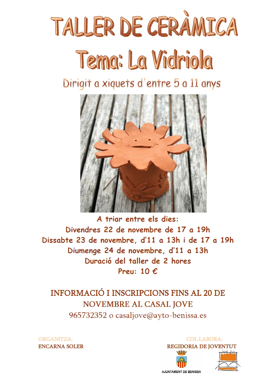 Una de les activitats, organitzades per la Regidoria de Joventut de l’Ajuntament de Benissa, que més acceptació té entre els xiquets del poble són les relacionades amb la ceràmica. Per aquest motiu, per a aquest mes de novembre s’ha organitzat un nou taller de ceràmica, aquesta vegada, amb la temàtica “La Vidriola”, pensat per als xiquets que tinguen entre 5 i 11 anys. Igual que els anteriors tallers, els més menuts, si ho desitgen, podran anar acompanyats pels seus pares.