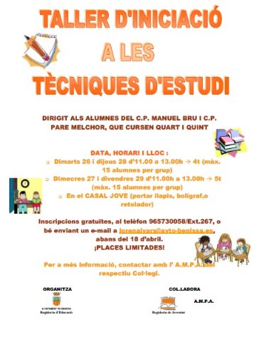 La Regidoria d’Educació de l’Ajuntament de Benissa, amb la col·laboració de la Regidoria de Joventut de Benissa i les AMPA de les escoles públiques del poble, donada l’acceptació que va tindre el Taller de Tècniques d’Estudi realitzat en el primer i segon trimestre d’aquest curs, ha organitzat un taller d’iniciació a les tècniques d’estudi, destinat als alumnes que cursen quart i cinqué de primària, a les escoles del municipi.