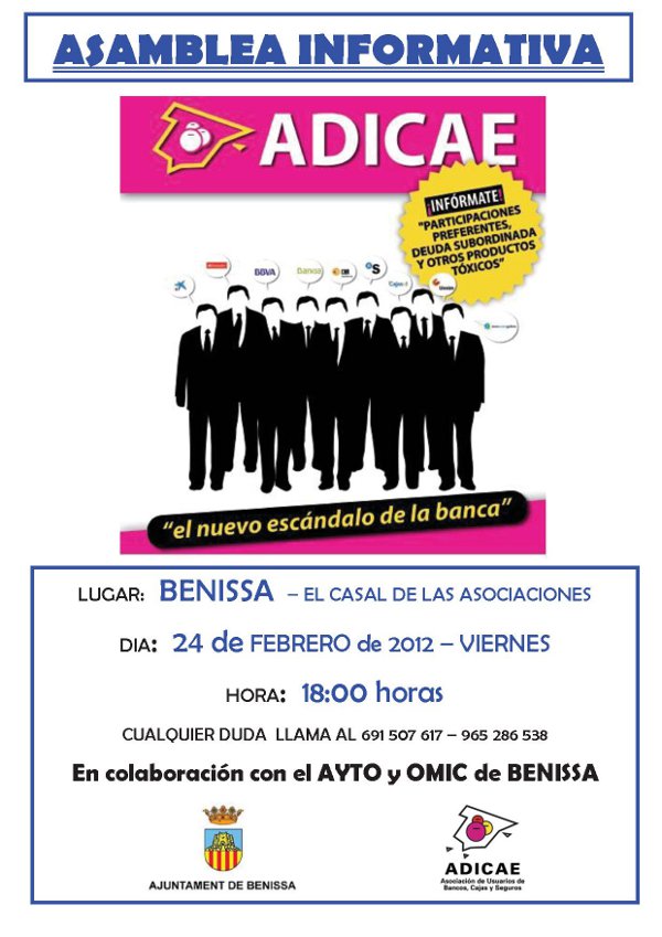 Des de la Regidoria de Consum de l’Ajuntament de Benissa mitjançant l’OMIC, s’ha organitzat en col·laboració amb ADICAE (Associació d’Usuaris de Bancs, Caixes d’Estalvis i Assegurances), una xerrada informativa per als interessats en temes relacionats amb productes financers.